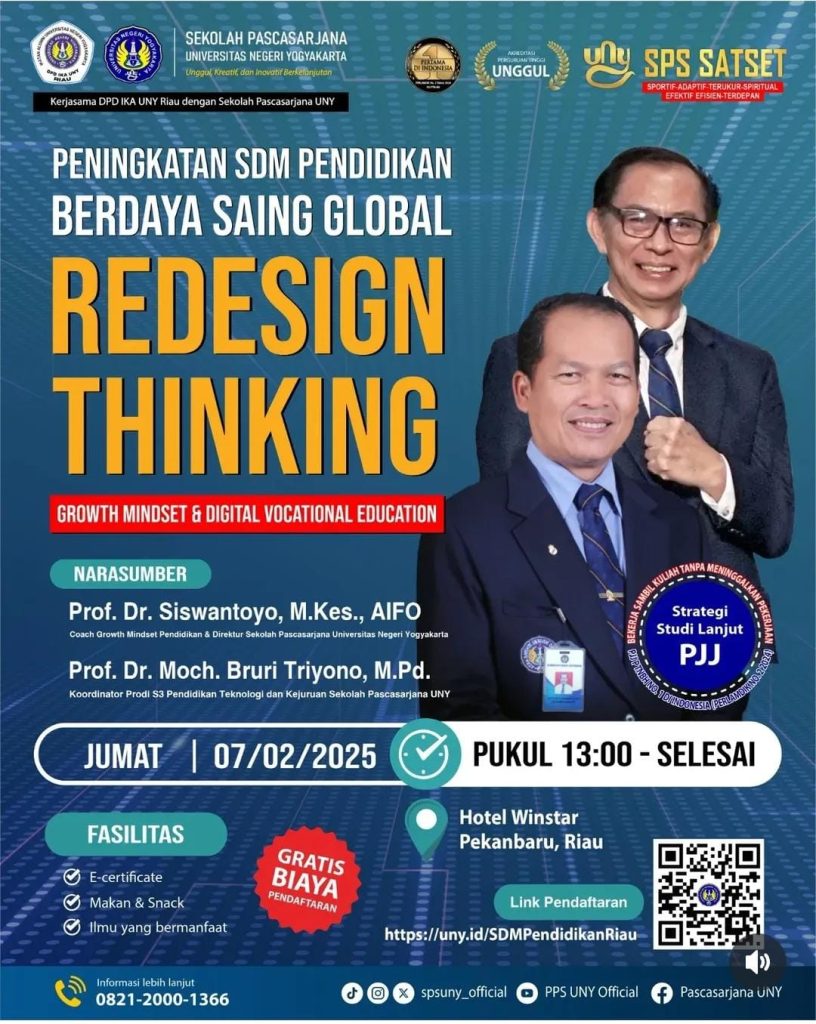 KERJA SAMA DPP IKA UNY RIAU dengan SEKOLAH PASCASARJANA UNY menghadirkan Prof. Dr. Siswantoyo, M.Kes, AIFO dan Prof. Moch Bruri Triyono, M.Pd. dalam tema “Peningkatan SDM Pendidikan Berdaya Saing Global : Redesign Thingking Grwoth Mindset & Digital Vocational Education” Jumat. 07 Februari 2025 di Hotel Winstar