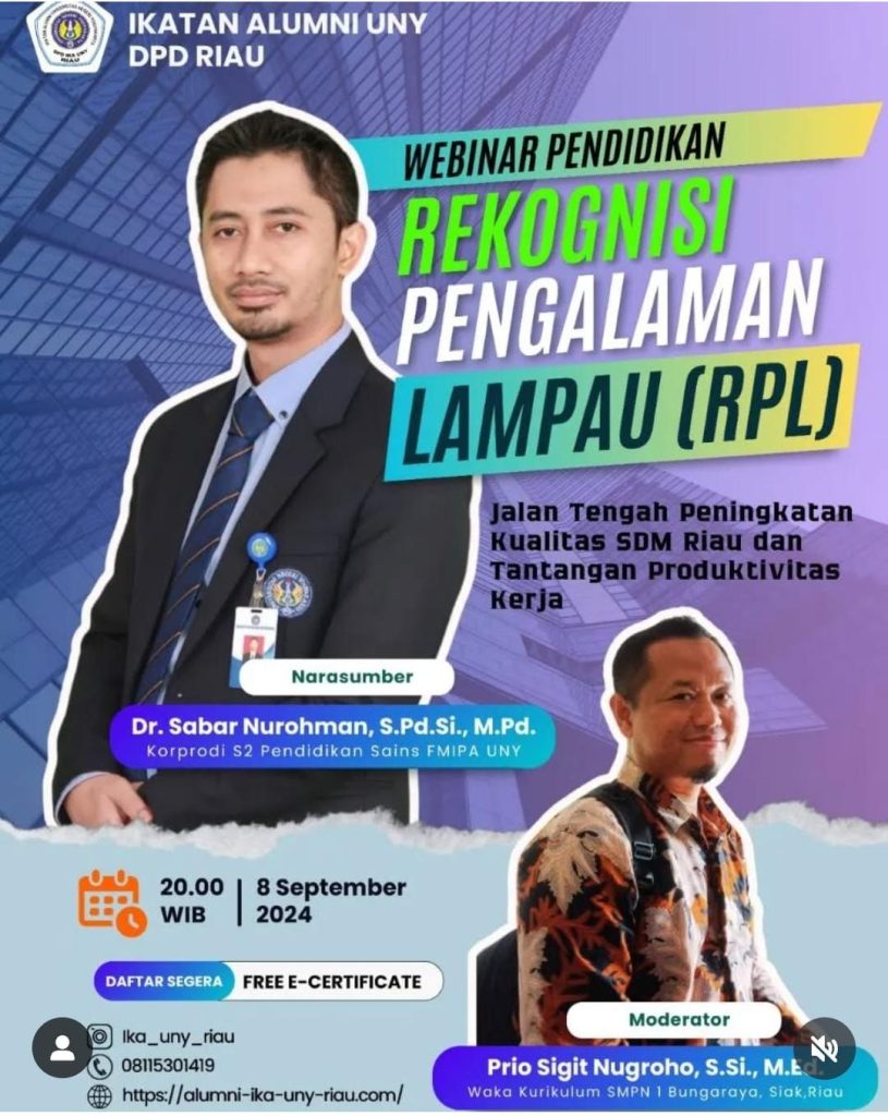 Pekanbaru – Dalam upaya meningkatkan kualitas pendidikan dan sumber daya masyarakat Riau, Dewan Pimpinan Daerah Ikatan Alumni Universitas Negeri Yogyakarta (DPD IKA UNY) Riau sukses menyelenggarakan webinar bertema “Rekognisi Pengalaman Lampau, Jalan Tengah Peningkatan Kualitas Pendidikan Sumberdaya Masyarakat Riau dan Tantangan Produktivitas Kerja”. Kegiatan ini dilaksanakan pada hari Ahad, 8 September 2024, pukul 20.00 hingga 22.00 WIB, melalui platform Zoom Meeting dengan dukungan fasilitasi dari Dewan Pimpinan Pusat (DPP) UNY.