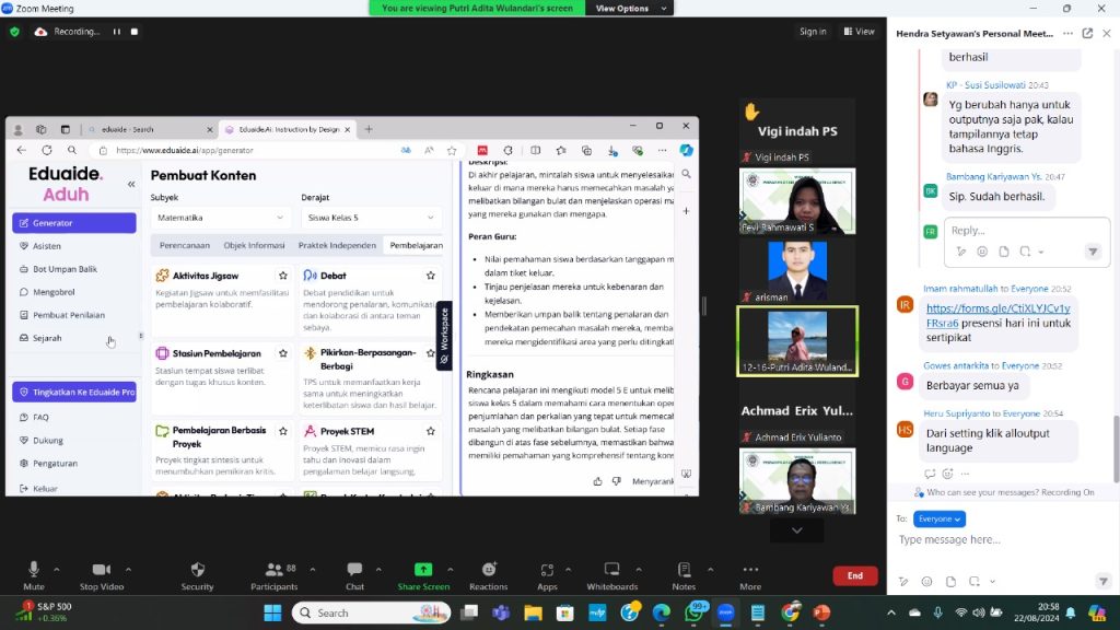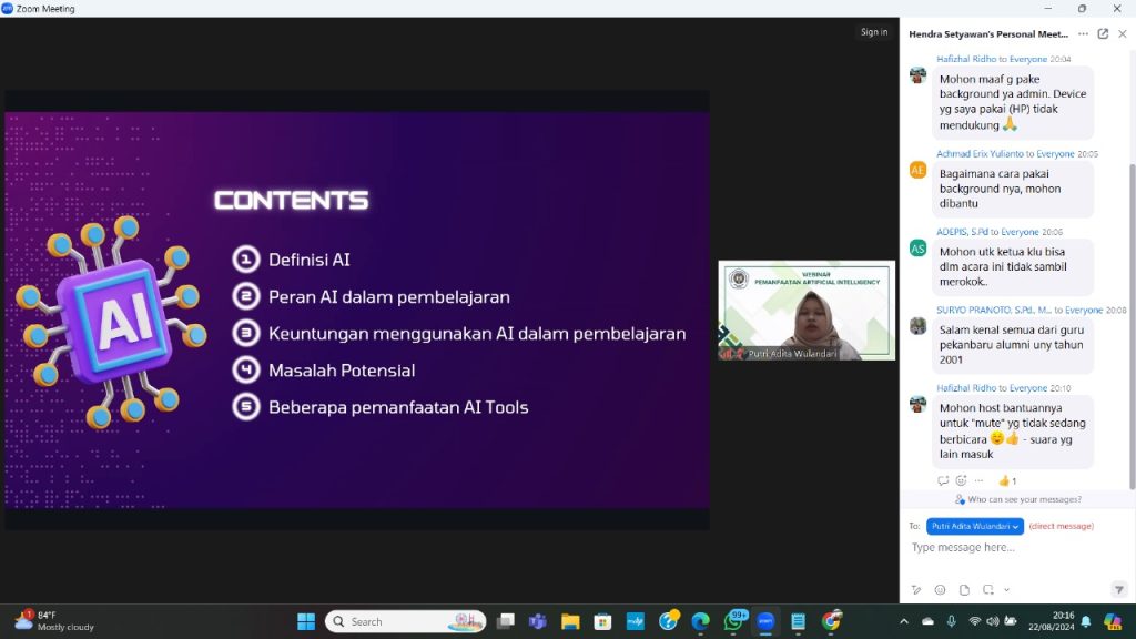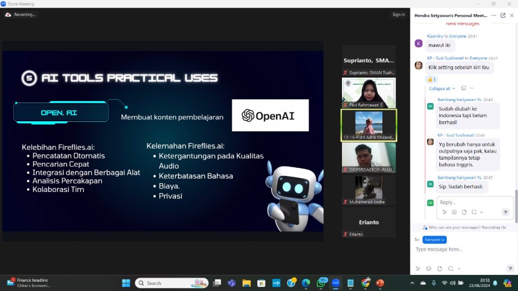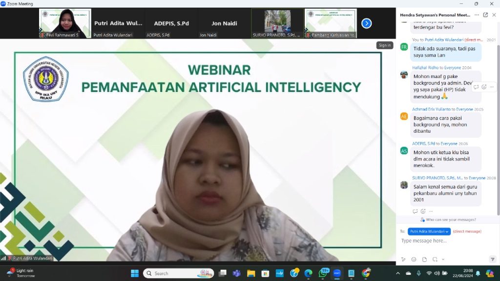 Pekanbaru, 22 Agustus 2024 – Dalam era digital yang terus berkembang, peran Artificial Intelligence (AI) dalam dunia pendidikan semakin mendapat perhatian. Pada Kamis malam, 22 Agustus 2024, sebuah webinar dengan tema “Pemanfaatan AI dalam Pembelajaran” sukses diselenggarakan, menarik minat ratusan pendidik dari seluruh Indonesia.