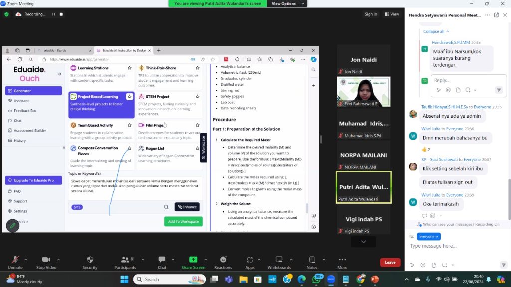 Webinar ini menampilkan Putri Adita Wulandari, M.Pd., seorang ahli dalam bidang pendidikan kimia yang memanfaatkan AI dalam pendidikan, sebagai narasumber utama. Acara ini dimoderatori oleh Fevi Rahmawati Suwanto, M.Pd., yang turut berperan dalam membangun diskusi yang produktif dan informatif sepanjang acara.
